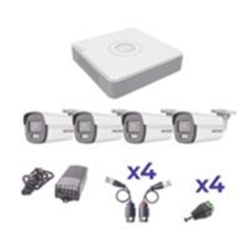 1 X DS-7104HGHI-K1S CARACTERSTICAS: DVR PENTAHIBRIDO: HD-TVI / HD-CVI / ANALOGICO / IP / AHD. SOPORTA AUDIO EN TODOS SUS CANALES POR COAXITRON. SOPORTA VIDEO EN 1080P LITE VISUALIZACIN REMOTA POR HIK-CONNECT 1 X PS-12DC4KV CARACTERSTICAS: FUENTE DE LARGA DISTANCIA ALIMENTACIN DE 11 - 15 VCC. FUSBILE TRMICO PTC INTEGRADO DE 5A. LED INDICADOR DE ALIMENTACIN. 4 X DS-2CE10DF0T-F CARACTERSTICAS: CMARA BALA 1080P USO EN EXTERIOR LENTE FIJO DE 2.8MM ANGULO DE VISIN 98° SOPORTA 4 TECNOLOGAS 20 METROS LUZ BLANCA E IMAGEN A COLOR 24/7 4 X TT101FTURBOZ CARACTERSTICAS: KIT DE TRANSCEPTORES PASIVOS TURBOHD TRANSMISIN EN TIEMPO REAL POR CABLE UTP CAT5E/6 NO REQUIEREN ALIMENTACIN 4 X JR-52 CARACTERSTICAS: DAMETRO: 2.1MM LARGO: 5.5MM CABLE SUGERIDO: CALIBRE 18