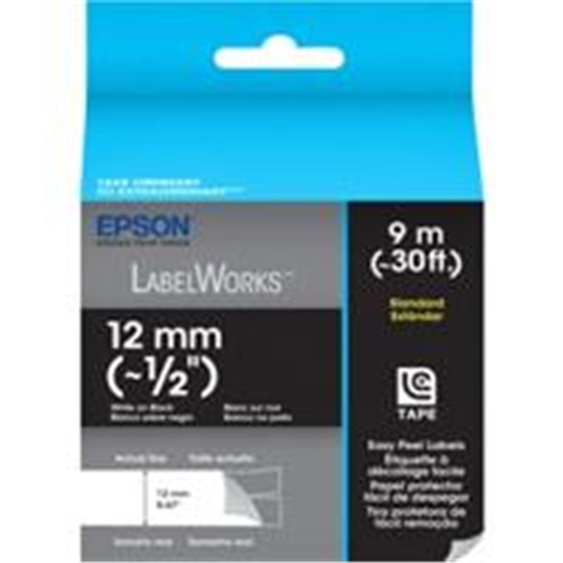 ANCHO : 12MM LARGO : 9 M ACABADO ESTANDAR COLOR DE FUENTE : BLANCO COLOR DE FONDO : NEGRO COMPATIBLE CON : LW-300 / LW-400