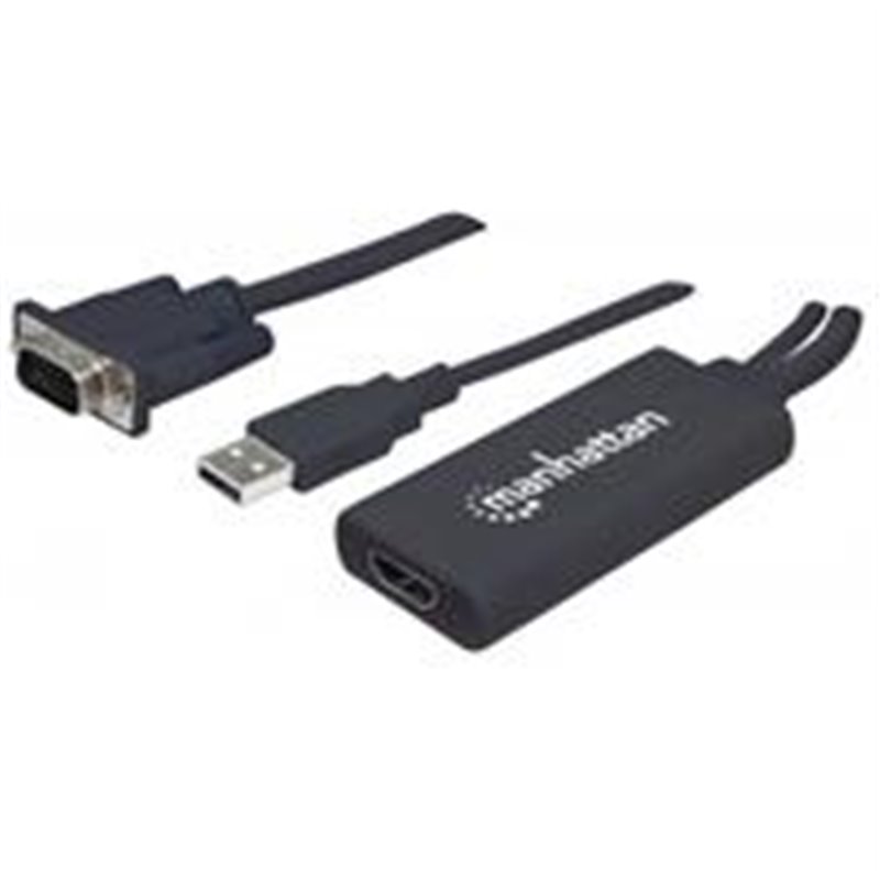 Convierte fácilmente video análogo VGA y audio USB a una señal digital HDMI Ideal para conectar Mac, PCs y Laptops a monitores de alta definición, HDTVs, proyectores y más soporta resoluciones de video VGA y HDMI de hasta 1920x1080; 1080p@60Hz, profundidad de color de 24 bits y banda amplificadora de video de hasta 1.65 Gbps / 165 MHz Brinda sonido digital USB de alta calidad; alimentado con una conexión Diseño compacto y portátil que cabe fácilmente en una mochila para laptop para presentaciones fuera de la oficina, para viajeros de negocio y más Trabaja mejor en combinación con el Cable HDMI de Alta Velocidad con Ethernet de Manhattan (323215) Plug and Play; compatible con Windows y Max; fácil de instalar Tres años de garantía