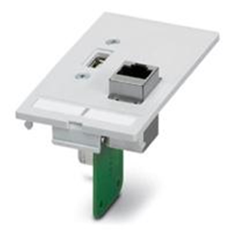 Placa frontal de datos con insertos de contactos, plástico con chapa pant., 1xUSB (hembra/hembra) construcc. A; 1xRJ45, 8 polos metal, CAT5e (hembra/hembra)