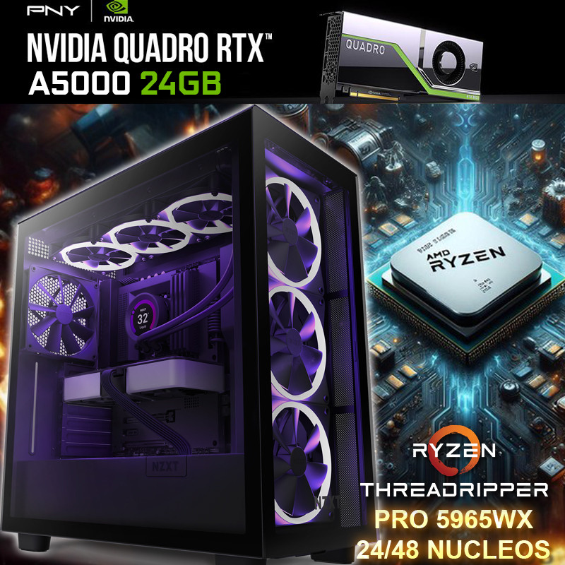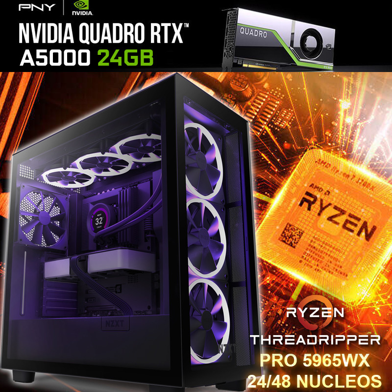 pc desktop workstation más poderosa del mercado para inteligencia artificial, renders y arquitectura. Tiene 24 núcleos y 48 hilos de alto rendimiento, una tarjeta de video profesional NVIDIA Quadro RTX A5000 de 24GB G-DDR6, memoria RAM de 256GB DDR4, 17-9
